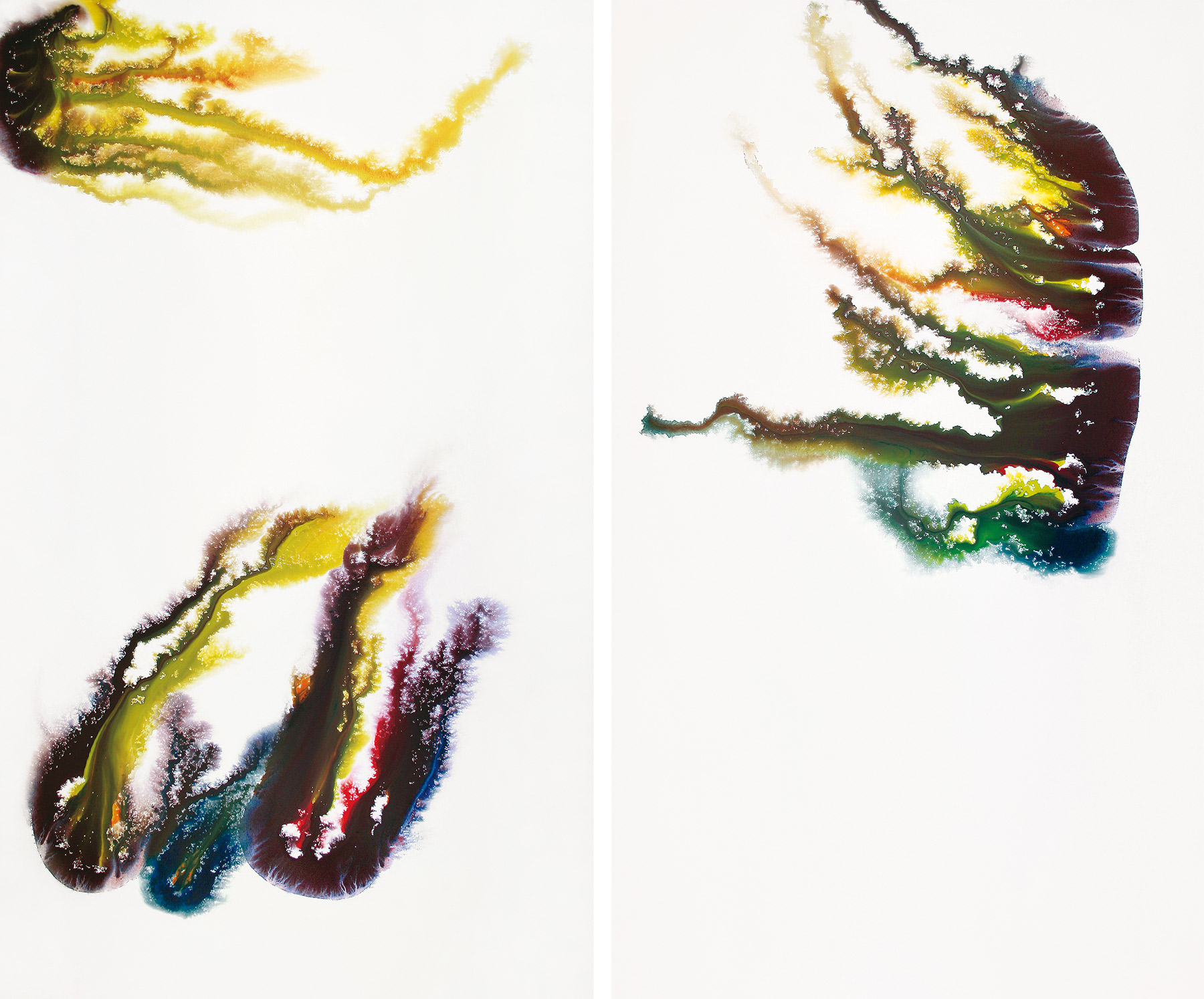 Apesar da explicação esclarecedora do próprio artista sobre o seu processo no Caderno de trabalho (“variação de entropia é uma forma de medir”, “entropia não é medida do caos”, “difusão de energia é a força de ação, em química”), em toda esta formulação artística o estudo dos comportamentos da tinta, dos pigmentos, dos líquidos, da emulsão, da difusão, da dispersão, etc. é capital, e favorece outra dinâmica de atuação (a presença da água ecoa sutilezas de aquarela, outras nuances e registros). Assim, todas as operações induzem a pensar que se trata de uma poética cuja lei de gravidade é mais gravitacional, pertence a outro plano de ação estética. Aliás, nestas tintas acrílicas sobre tela ou papel, o espaço pictórico nunca deixa de ser também um espaço mental, no qual o branco do vazio diz muito. “Assim o vazio não é a nada. O vazio é o quadro” diz Zhang Shi.