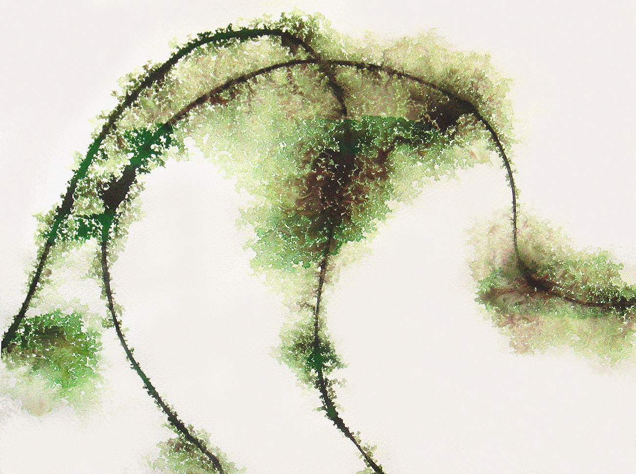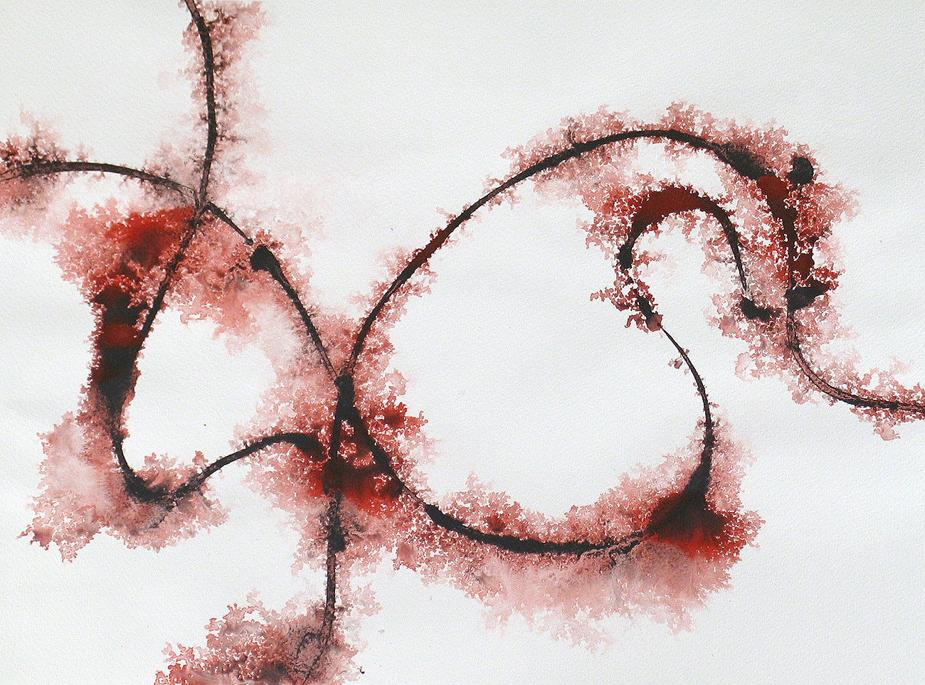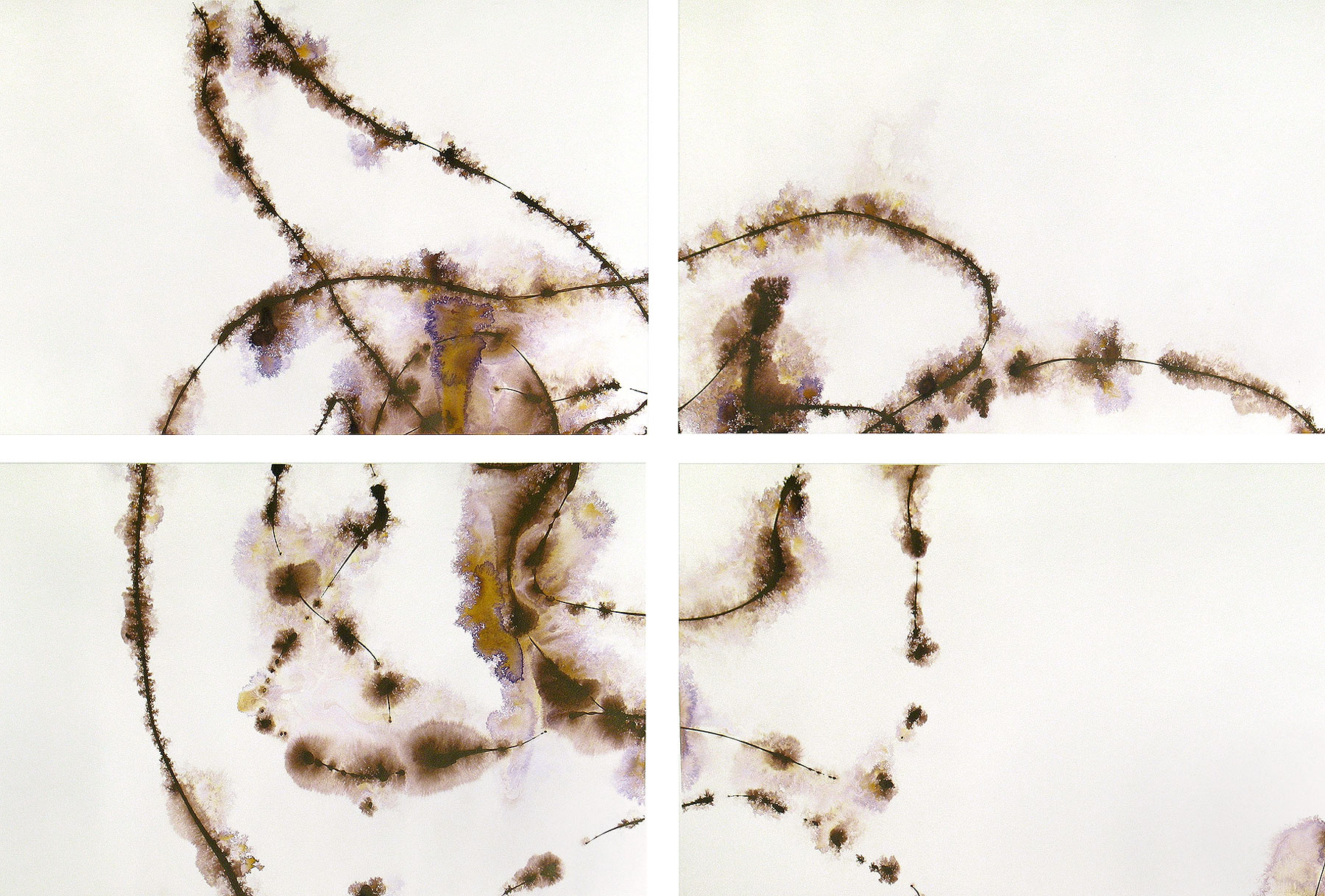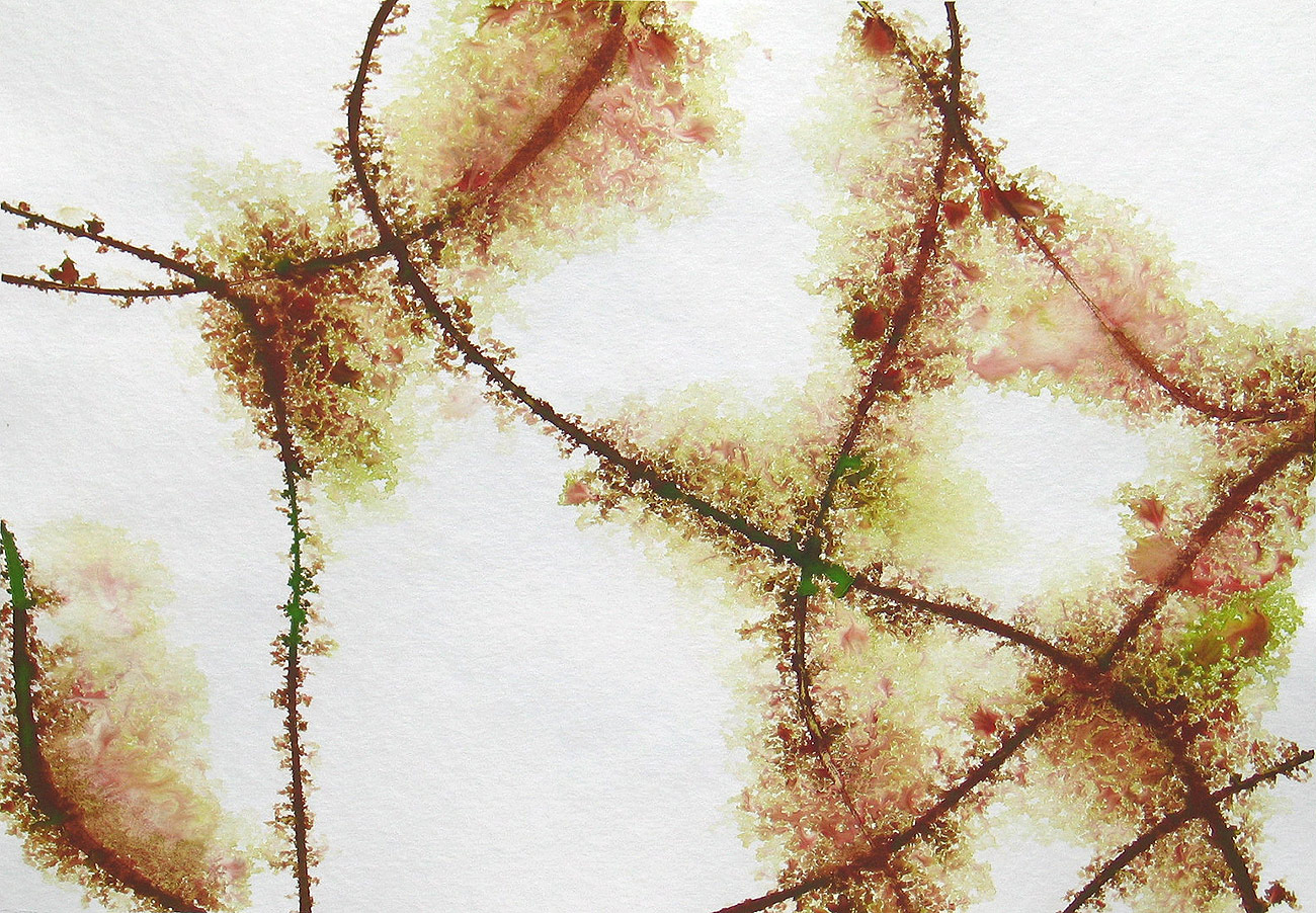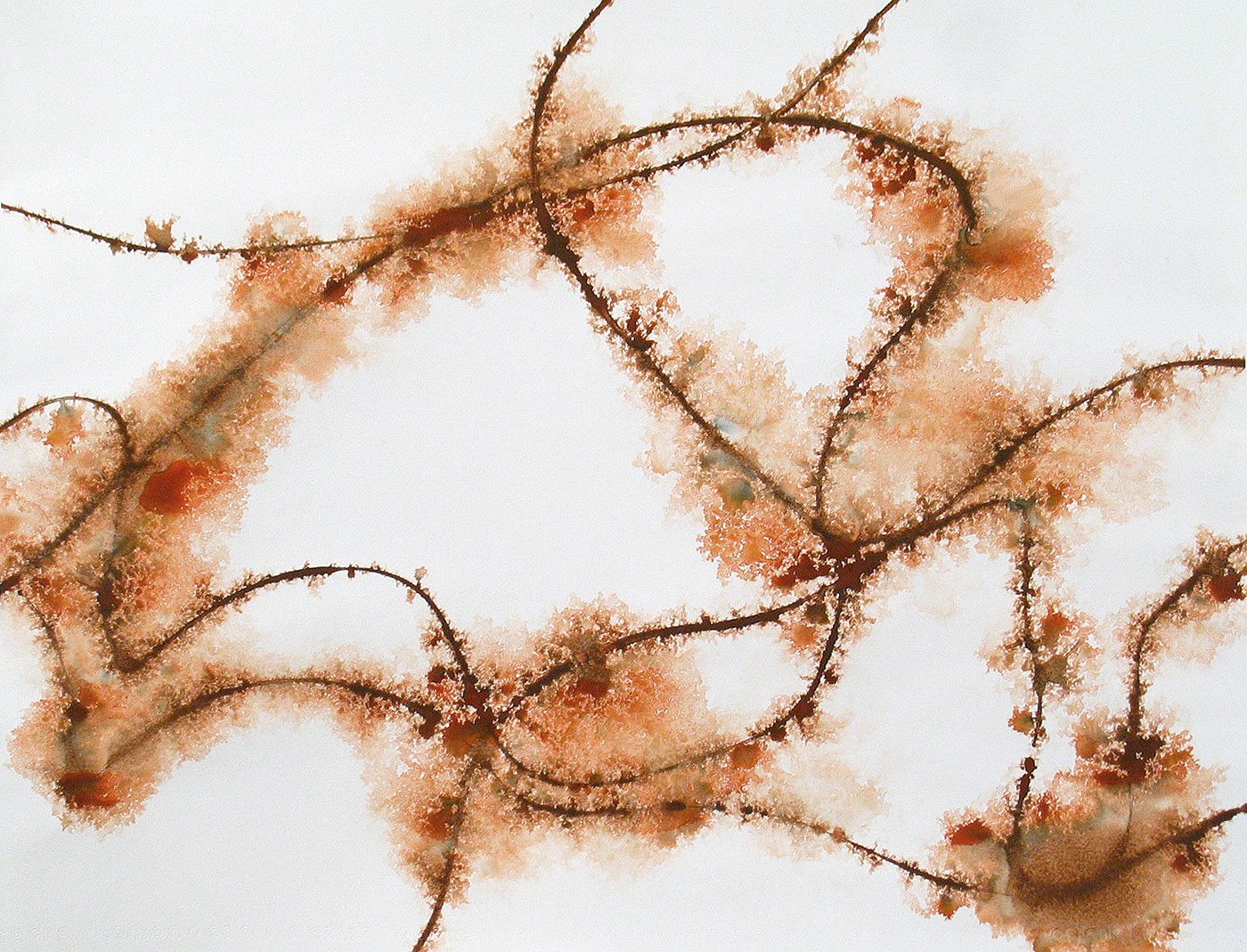Esses trabalhos vem sendo desenvolvidos em paralelo às pinturas e seguem seus procedimentos porém com adaptações. Eles também evidenciam sua linguagem/ processo onde fenômenos da natureza (difusão, gravidade, capilaridade, etc) são utilizados como ferramentas de construção. Quase não há o uso do pincel mas o direcionamento do fluxo de tinta de forma indireta. Os espaços criados são facilmente associados aos naturais uma vez que os mecanismos são os mesmo usados pela natureza para a construção da paisagem, dos tecidos celulares, corais, dispersão dos gases estelares, etc. Não temos aqui a tradicional metáfora para o mundo natural mas um curto-circuito de signficados.